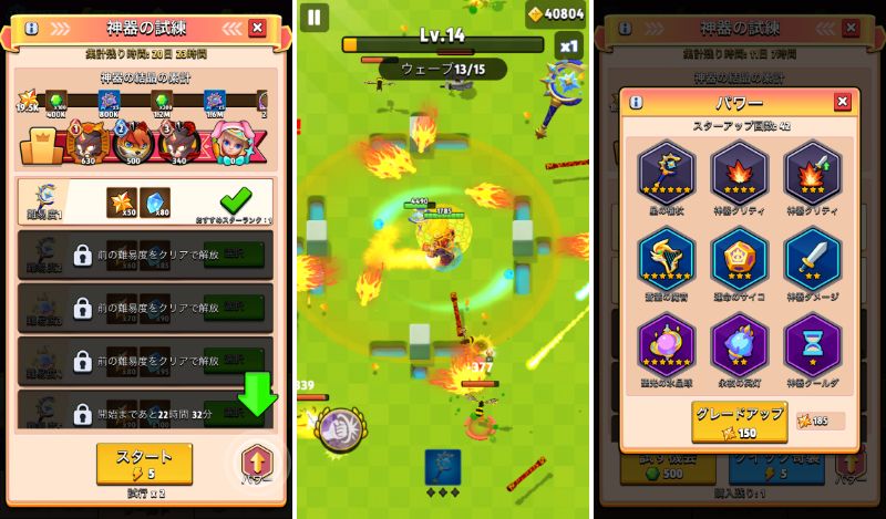 ここでの神器は通常のそれのようにプレイヤーの周りは回らずステージ中央に固定されており、一定範囲内に効力を発揮する。パワーで取得や強化できるほか、ヒーローのレベルアップ時に進化することもある。複数の神器がアンロックされている場合にはどの神器を進化させるかを選べる。Aの杖がこのイベントでは強いので優先すると良いようだ。