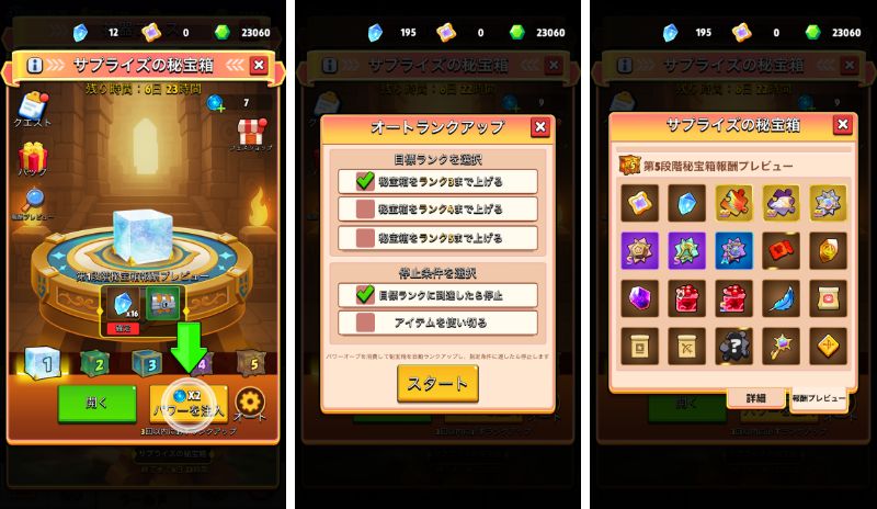 1プレイに5エネルギーを消費し、1日2回まで無料、200ジェムと500ジェムでもう2回おかわりできる。おかわりは高く感じるが、6周年イベントでは併催のサプライズの秘宝箱よりもこちらに200ジェム使う方がトークン(心)の効率が高かった。