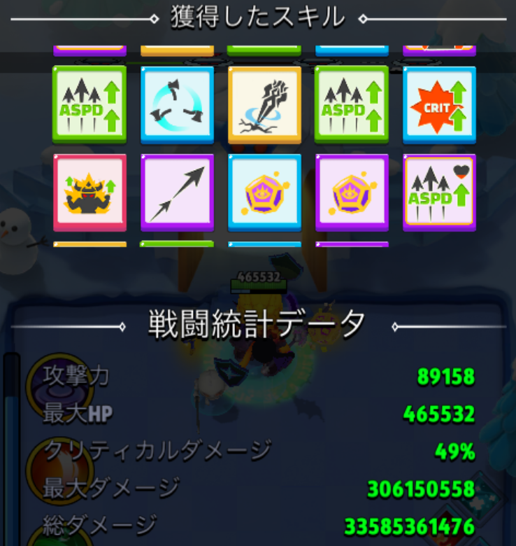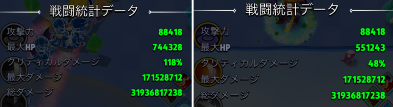 クリティカルダメージについては、タスクキルすると(スキルなどで)事後獲得した分も消えてしまい必ず40%台に戻ってしまう。攻撃力や最大HPも開始時の値に戻り、ポーズ画面に表示されていない他のステータスについても同様である可能性がある。