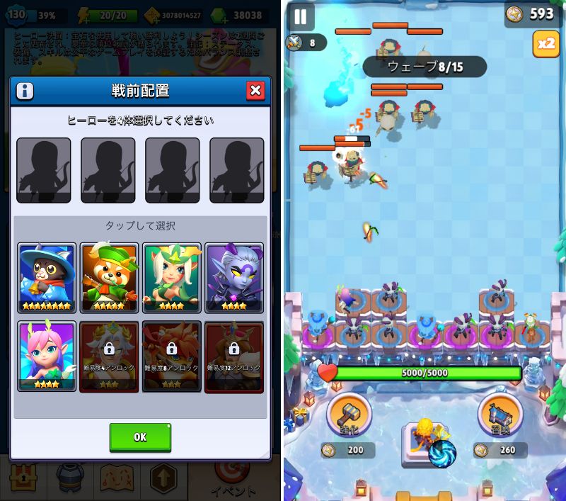 砦の戦線(Fortress Frontline)は2025年12月に初開催されたイベントタブのイベント。バッグバトルと同様に、上から攻めてくるモンスターたちと戦う。 戦闘中に直接ヒーローを操作することはできず、自動で攻撃してくれるのを見守ることになる。ゲージが溜まるとボムのようなものが出るがこれも全自動。敵が最下部まで到達すると砦のHPが減少し、0になると敗北。15ウェーブ 最初に「戦前配置」で規定のヒーローの選択肢から4人を選ぶ。クリスマスに初開催されたイベントということで、登場するヒーローはクリスマス衣装を持つものから選ばれているようだ。 ドロップするトークン「砦コイン」を消費して「追加」すると下方の枠にヒーローが一人登場する。コストは10,20,30,45,60,80,100、以降20ずつ500まで上昇する。以後は500固定で、特に回数制限などはないようだが、砦の枠が一杯になるとそれ以上追加できなくなる。枠は時々アトランダムに増設されることがある。 同じ種類で同じレアリティのヒーローはドラッグアンドドロップにより合成して4段階までレアリティを上げられる。この時、同じヒーローではなくランダムのヒーローになる。 また、同じくコインを消費して「強化」するとランダムのヒーローに対するランダムのスキルを3択で獲得できる。コストは100,200,400,600,800…と急激に上昇する。コインでの強化回数はかなり限られるのだが、各ヒーローを初めて最高レアリティに上げた時にも無料で1つスキルを獲得する(レアリティを上げるとヒーローが変わってしまうので狙うのは難しいが…)。レアリティアップにより無料で強化しても次の強化コストが上がってしまうため、序盤のうちは最高レアリティの前で止めておきコインで強化できるだけしてしまう方が良いだろう。 ドロップ報酬のほかにプレイごとにポイントを獲得し、一定ポイントごとに報酬が得られる。勝利すると難易度を1つ上げられ、難易度が高いほど得られるポイントが高い。また、難易度が上がると選択できるヒーローも増加する。 基本的には、いかにもたつかず効率的にヒーローの追加・合成・強化を進められるかを競うゲームのようだ。常に追加ボタンを連打し、追加より強化の方が安くなったら強化し、空き枠が1~2つになったら弱いヒーローから合成していくと概ね問題なく勝ち進めるようである。ボルト・ダークタッチ・跳ね返りなどの誘爆系のスキルが取れるとぐっと楽になる。 |