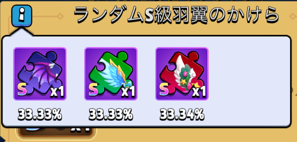 実装時点ではかけらの入手手段がなかったが、2024年12月のパズルイベントでAの「精霊の翼」が無償提供、ラッキーボールイベントでSの「闇夜の翼」やSSの「審判の翼」などが有償提供されていた。今後もイベントでの提供が中心になるものと思われる。